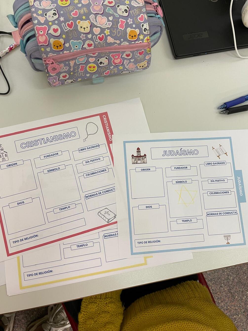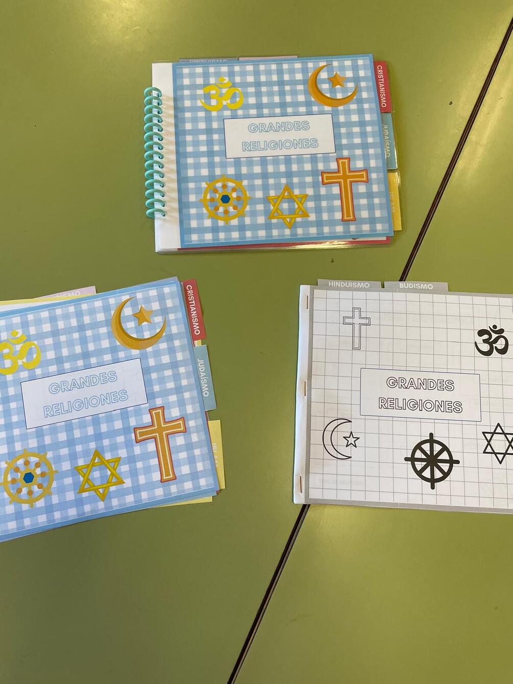 1 flipbook compuesto por 5 hojas por una cara; 1 por religión. Con su portada.